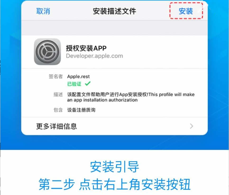描述文件是经过苹果公司认证的,用来记录用户设备,请放心使用。安装描述文件,是为了将您的设备注册到苹果用户库。是安装苹果APP的必备条件。